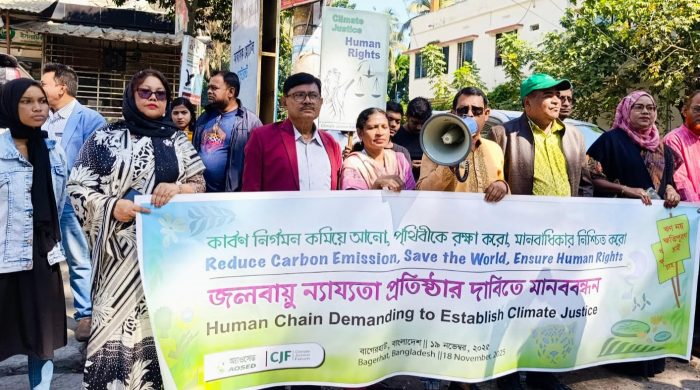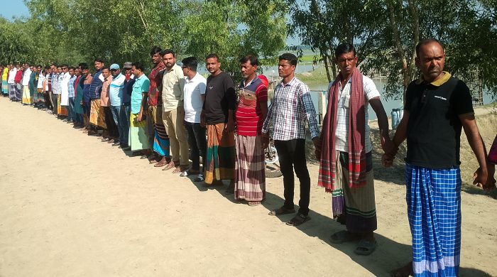 বাগেরহাট প্রতিনিধি: বাগেরহাট সদর উপজেলার ডেমা ইউনিয়নের খেগড়াঘাট এলাকায় সুইস গেট নির্মাণের দাবিতে মানববন্ধন করেছে স্থানিয় কৃষকরা। এলাকাবাসীর উদ্যোগে আয়োজিত এ কর্মসূচিতে প্রায় দুই শতাধিক কৃষক এ মানববন্ধনে অংশ নেন।