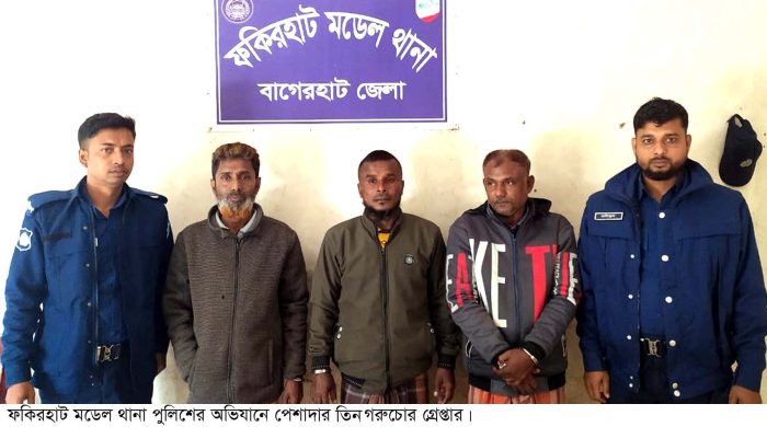 ফকিরহাট প্রতিনিধি : ফকিরহাট মডেল থানা পুলিশের অভিযানে পেশাদার তিন গরু চোরকে গ্রেপ্তার করেছে। তাদের স্বীকারোক্তি মোতাবেক চারটি গরু উদ্ধার করা হয়েছে। গ্রেপ্তারকৃতরা হলেন-ফকিরহাট উপজেলঅর বালিয়াডাঙ্গা এলাকার মৃত নুরমোহম্মদের ছেলে