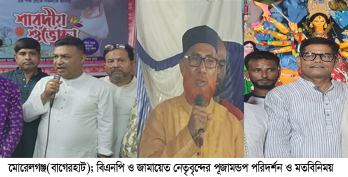 মেহেদী হাসান লিপন,মোরেলগঞ্জ (বাগেরহাট) সংবাদদাতা : বাগেরহাটের মোরেলগঞ্জে বিএনপি ও জামায়াতের নেতৃবৃন্দ উপজেলার বিভিন্ন পূজামন্ডপ পরিদর্শন করে মতবিনিময় ও আর্থিক অনুদান প্ধসঢ়;্রদান করেছেন। মঙ্গলবার রাতে জেলা বিএনপি নেতা কাজী খায়রুজ্জামান আরো....
