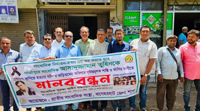 বাগেরহাট প্রতিনিধিঃ গাজীপুরে সাংবাদিক অহিদুজ্জামান তুহিনের হত্যার সাথে জড়িতদের গ্রেফতার ও গ্রেফতারকৃত সকল আসামিদের দ্রুত বিচারের আওতায় এনে ফাঁসির দাবিতে এবং সাংবাদিক সুরক্ষা আইন বাস্তবায়নে জাতীয় সাংবাদিক সংস্থা বাগেরহাট জেলা