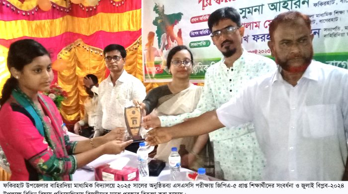 ফকিরহাট প্রতিনিধি : ফকিরহাট উপজেলার বাহিরদিয়া মাধ্যমিক বিদ্যালয়ে ২০২৫ সালের অনুষ্ঠিতব্য এসএসসি পরীক্ষায় জিপিএ-৫ প্রাপ্ত শিক্ষার্থীদের সংবর্ধনা ও জুলাই বিপ্লব-২০২৪ উপলক্ষে বিভিন্ন বিষয়ে প্রতিযোগিতায় বিজয়ীদের মাঝে পুরস্কার বিতরণ করা হয়েছে।