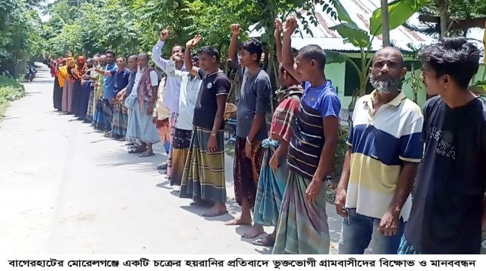 মোরেলগঞ্জ (বাগেরহাট) প্রতিনিধি: বাগেরহাটের মোরেলগঞ্জের খাউলিয়া ইউনিয়নের ছোটপরি গ্রামে একটি চক্রের অত্যাচারে অতিষ্ঠ গ্রামবাসি। রবিবার বেলা ১১টায় প্রতিবাদে বিক্ষোভ ও মানববন্ধন করেছেন স্থানীয় ভুক্তভোগীরা। এ ঘটনায় ভুক্তভোগীদের পক্ষে মোশারেফ হোসেন