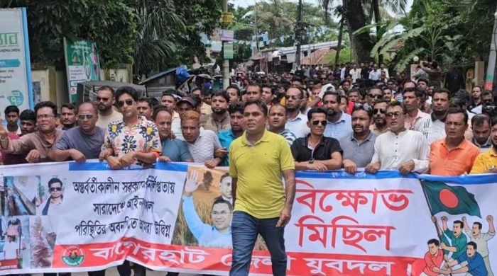 বাগেরহাট প্রতিনিধি: সারা দেশে আইনশৃঙ্খলার অবনতি ও নিষিদ্ধ ঘোষিত সংগঠন ছাত্রলীগের সন্ত্রাসীদের দ্রুত আইনের আওতায় আনার দাবিতে বাগেরহাটে বিক্ষোভ মিছিল করেছে যুবদলের নেতৃবৃন্দ। বৃহস্পতিবার দুপুরে বাগেরহাট শহরের স্বাধীনতা উদ্যান থেকে