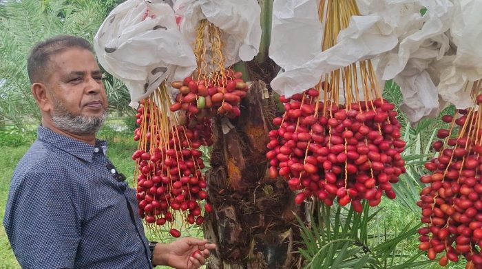 এস এম রাজ,বাগেরহাট প্রতিনিধিঃ উপকূলীয় জেলা বাগেরহাটের লোনা মাটিতে এবার নতুন সম্ভাবনার দুয়ার খুলেছেন এডভোকেট জাকির হোসেন। ২০১৯ সালে ইউটিউব দেখে সখের বসে শুরু করেছিলেন সৌদি খেজুরের চাষ। সেই সখ