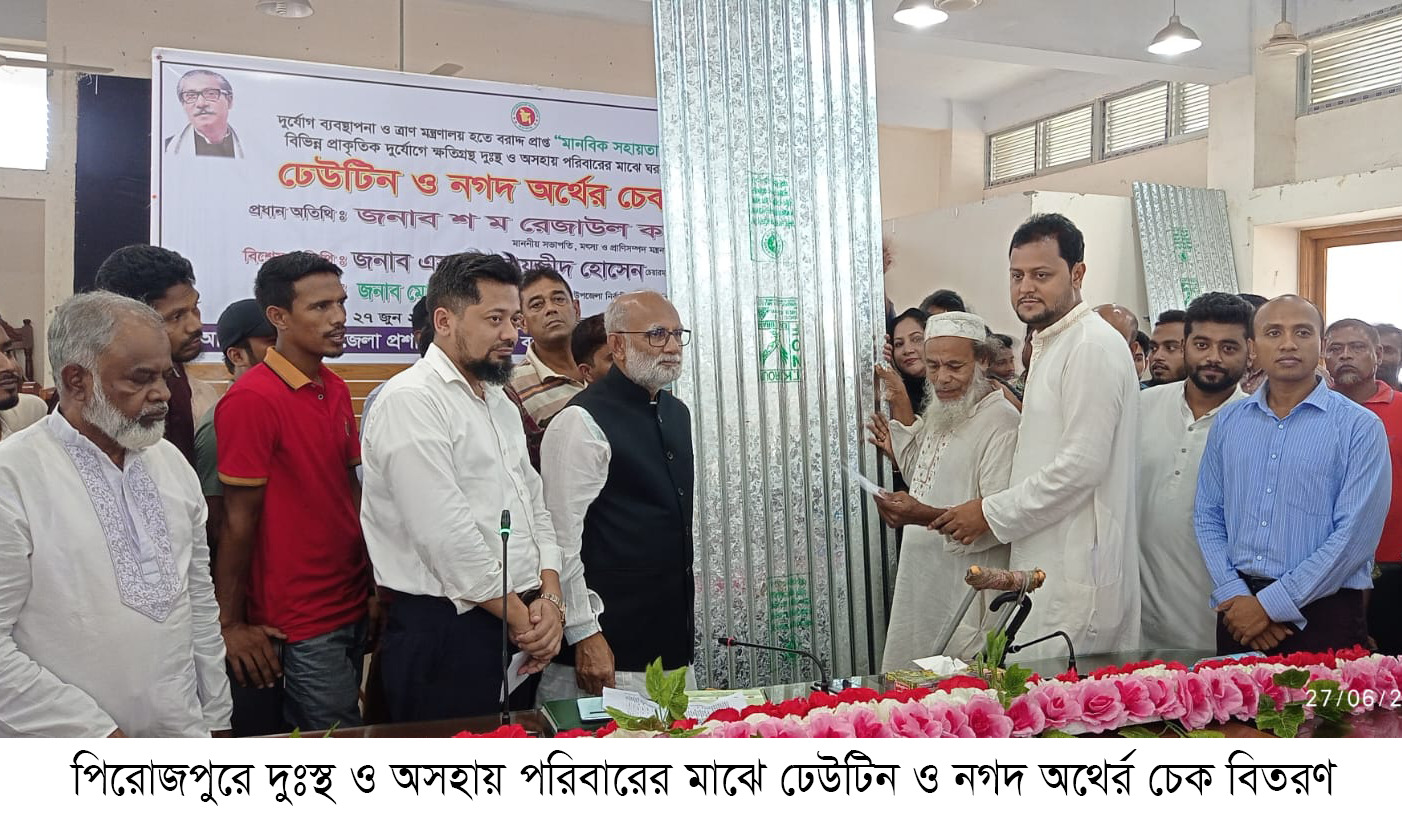 রিপন মাহমুদ, পিরোজপুর: পিরোজপুরে দুর্যোগে ক্ষতিগ্রস্ত দুঃস্থ ও অসহায় পরিবারের মাঝে ঘরবাড়ি মেরামতের জন্য ঢেউটিন ও নগদ অর্থের চেক বিতরণ