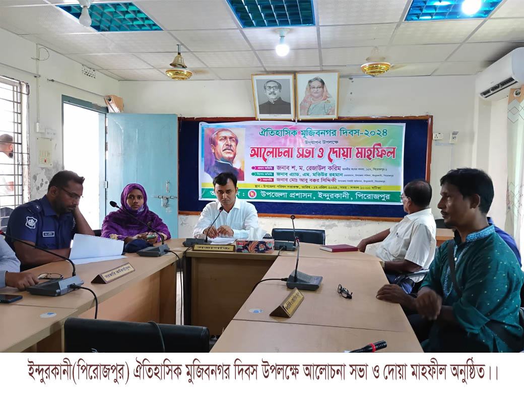 ইন্দুরকানী(পিরোজপুর) প্রতিনিধি: পিরোজপুরের ইন্দুরকানীতে ঐতিহাসিক মুজিবনগর দিবস উপলক্ষে আলোচনা ও দোয়া মাহফীল অনুষ্ঠিত হয়েছে। দিবসটি উপলক্ষে১৭ মার্চ সকালে উপজেলা পরিষদ