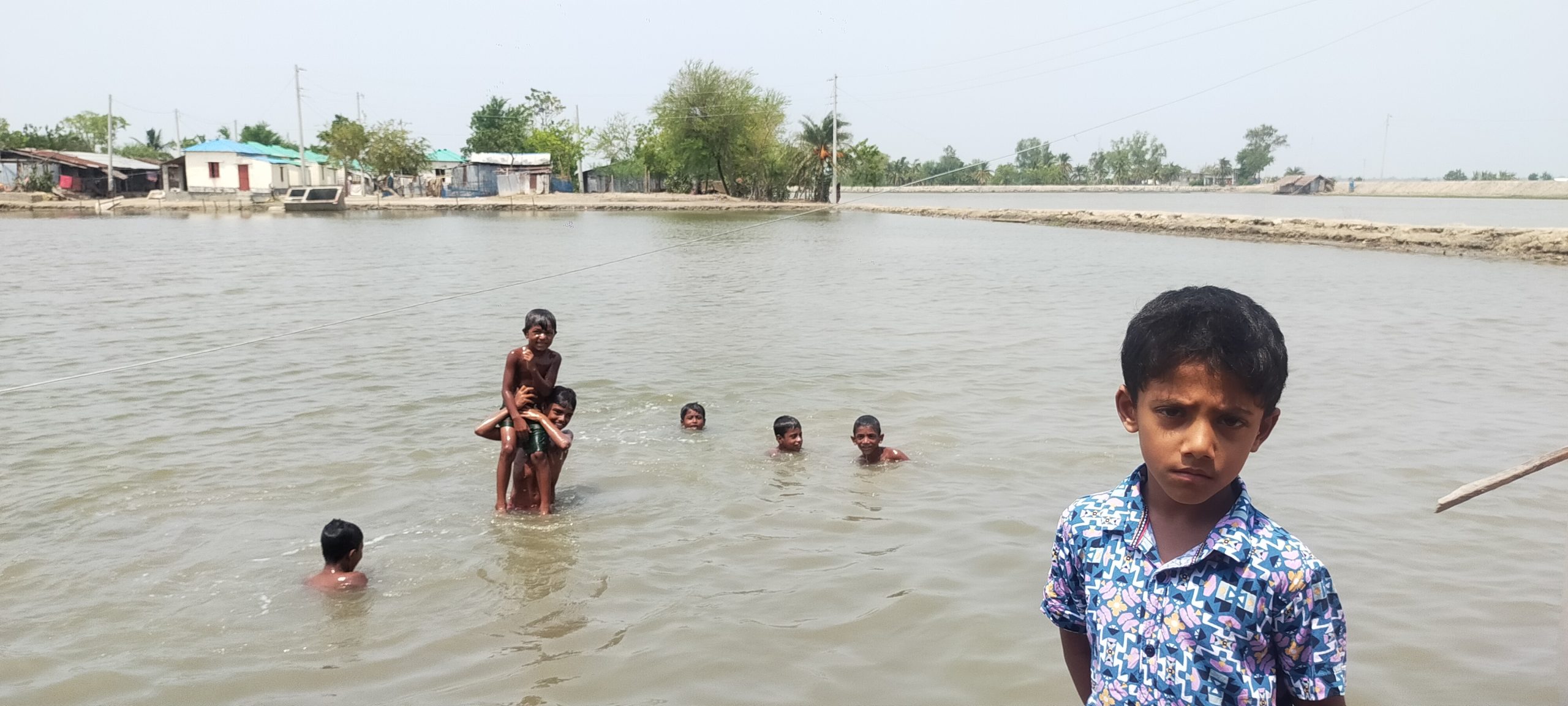 তীব্র গরমে পুকুরের পানিতে উপকূলীয় শিশুদের দুরন্তপনা