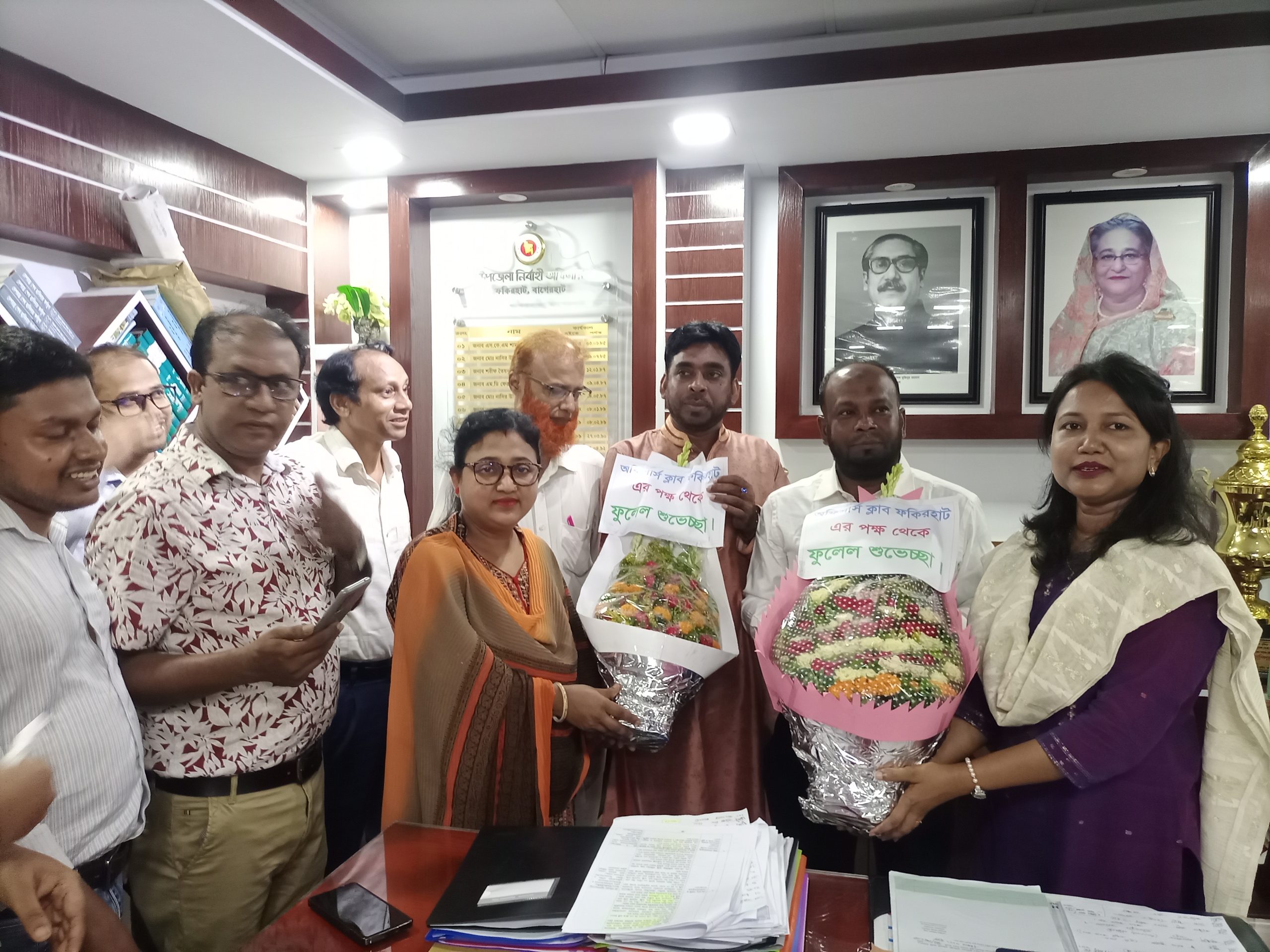 ফকিরহাটে নবনির্বাচিত উপজেলা চেয়ারম্যান ও ভাইস চেয়ারম্যানদের ফুলেল শুভেচ্ছা