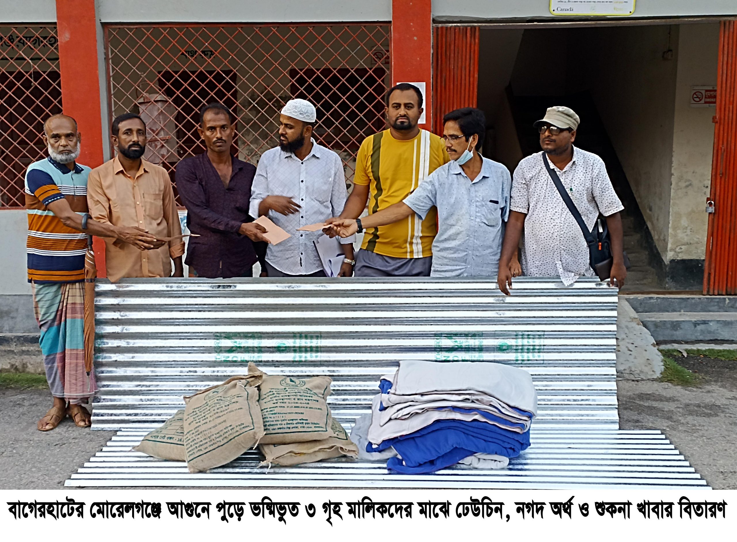 মোরেলগঞ্জে আগুনে পুড়ে ৩ বসত গৃহ মালিক পেলেন নগদ অর্থ, ঢেউটিন ও শুকনা খাবার