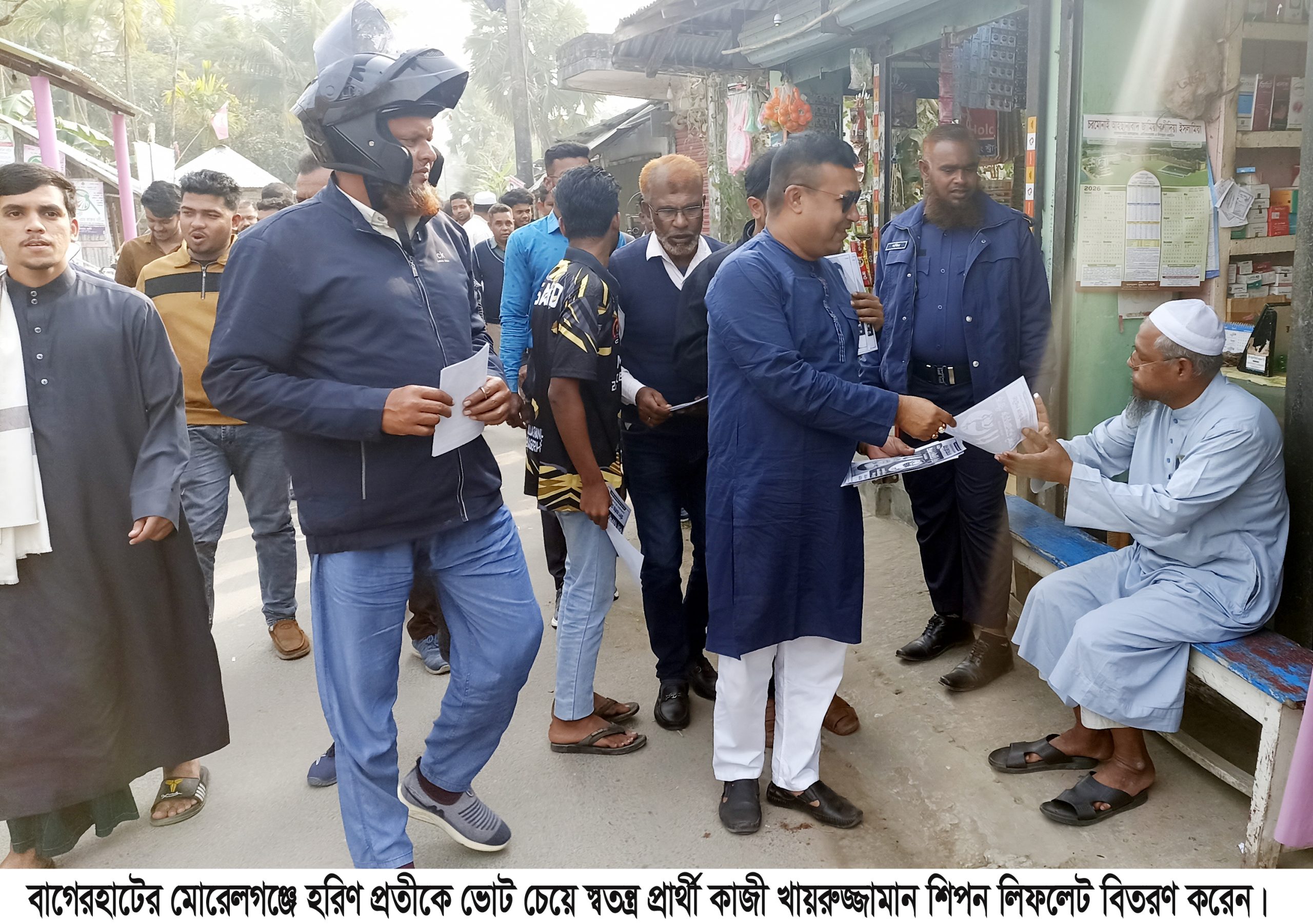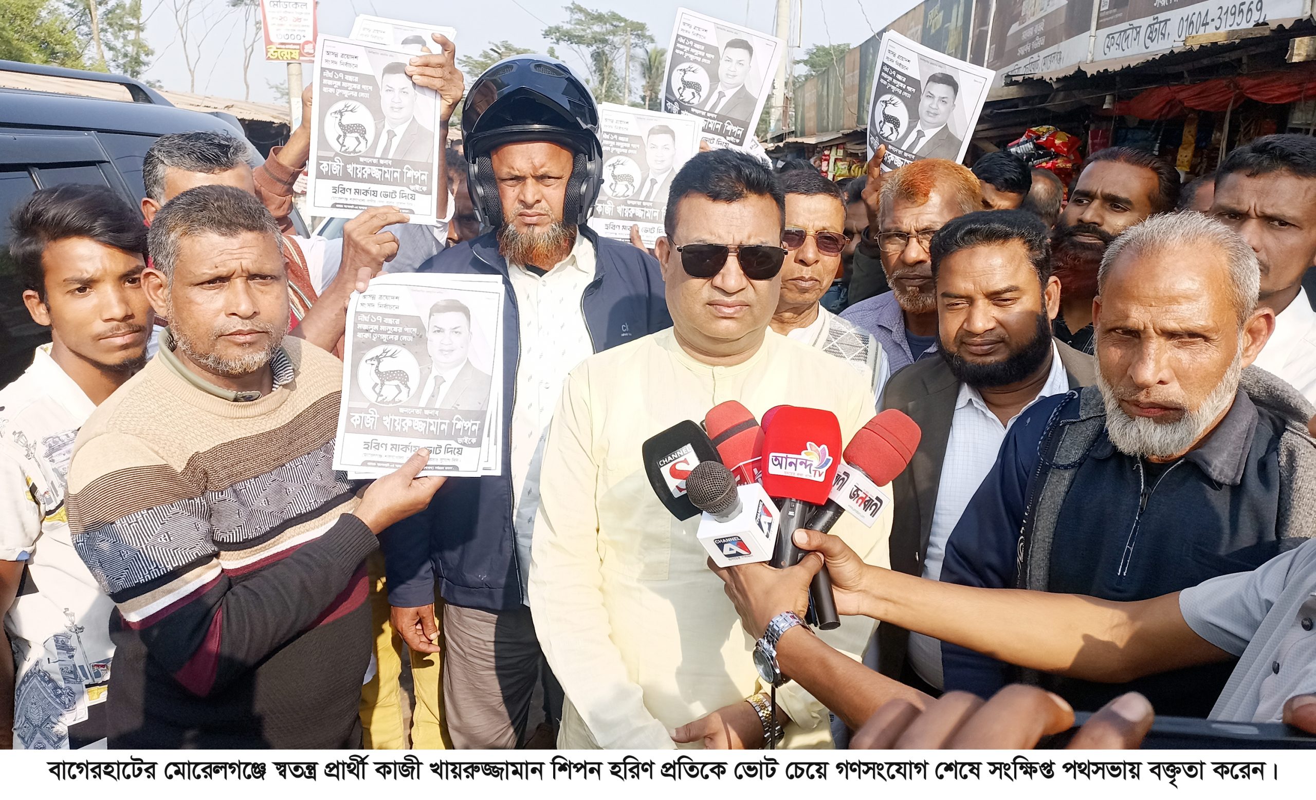 এম. পলাশ শরীফ, বাগেরহাট : বাগেরহাট-৪, মোরেলগঞ্জ-শরণখোলা আসনের স্বতন্ত্র প্রার্থী কাজী খায়রুজ্জামান শিপন তার হরিণ প্রতীকে ভোট চেয়ে গণসংযোগ ও