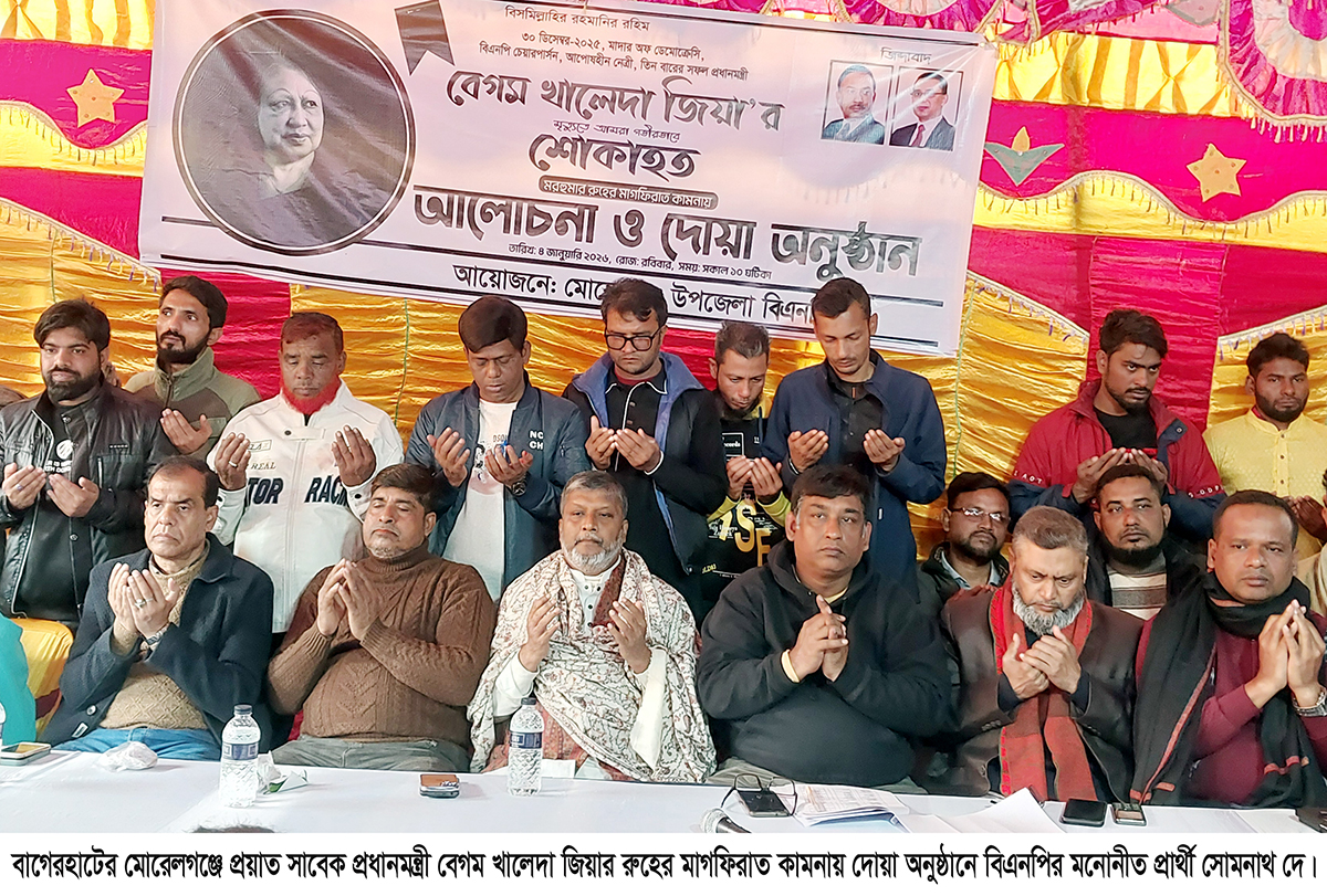 মোরেলগঞ্জ প্রতিবেদক: প্রয়াত সাবেক প্রধানমন্ত্রী বিএনপির চেয়ারপারর্সন বেগম খালেদা জিয়ার রুহের মাগফিরাত কামনায় বাগেরহাটের মোরেলগঞ্জে দোয়া ও মিলাদ মাহফিল অনুষ্ঠানে