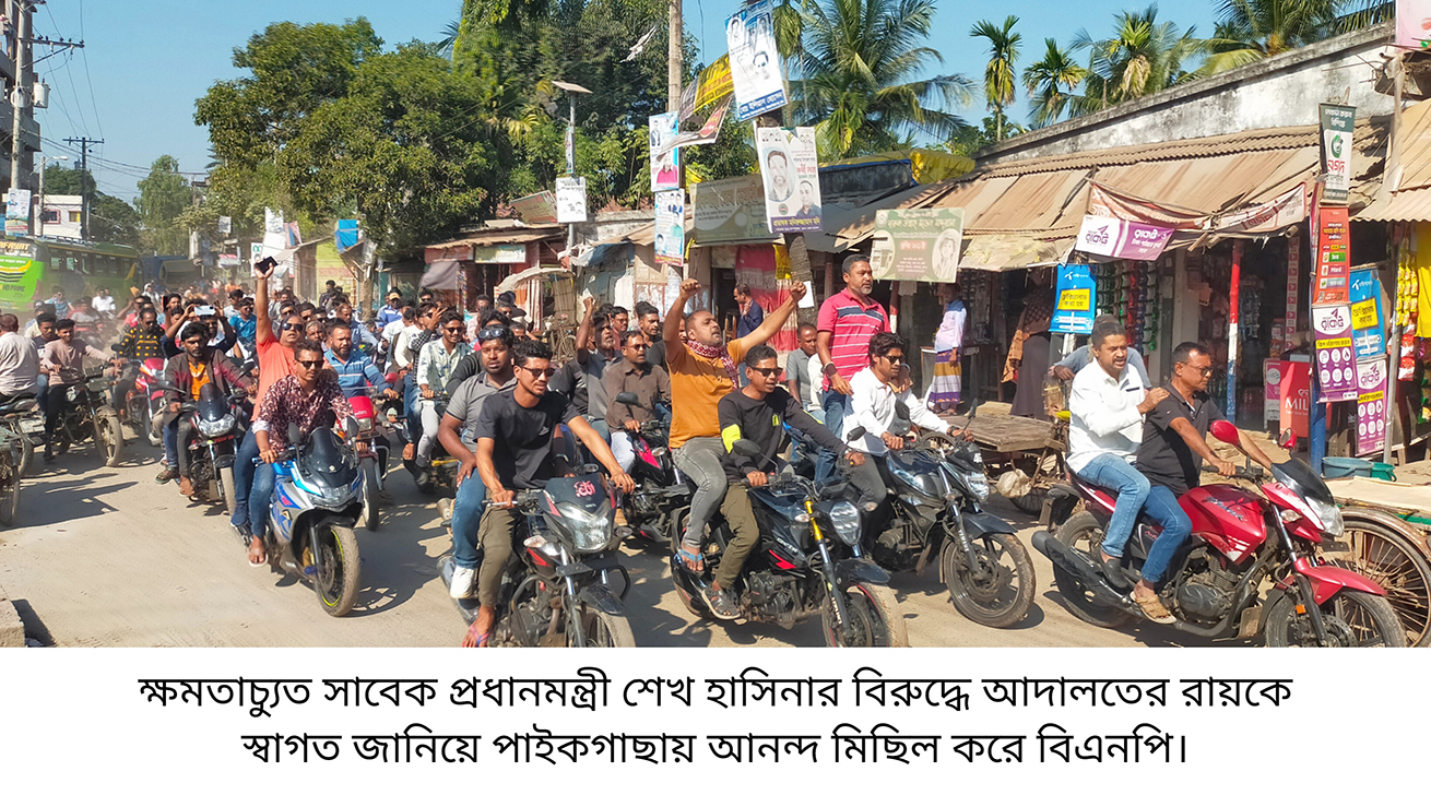 শেখ হাসিনার বিরুদ্ধে আদালতের রায়কে স্বাগত জানিয়ে পাইকগাছায় বিএনপির মিছিল ও মোটরসাইকেল শোভাযাত্রা
