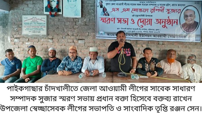 পাইকগাছা (খুলনা) প্রতিনিধি: খুলনা জেলা আওয়ামী লীগের সাবেক সাধারণ সম্পাদক ও সাবেক হুইপ এস এম মোস্তফা রশিদী সুজার ষষ্ঠ মৃত্যু বার্ষিকী উপলক্ষে স্মরণ সভা অনুষ্ঠিত হয়েছে। শনিবার বিকালে পাইকগাছার চাঁদখালী ইউনিয়ন