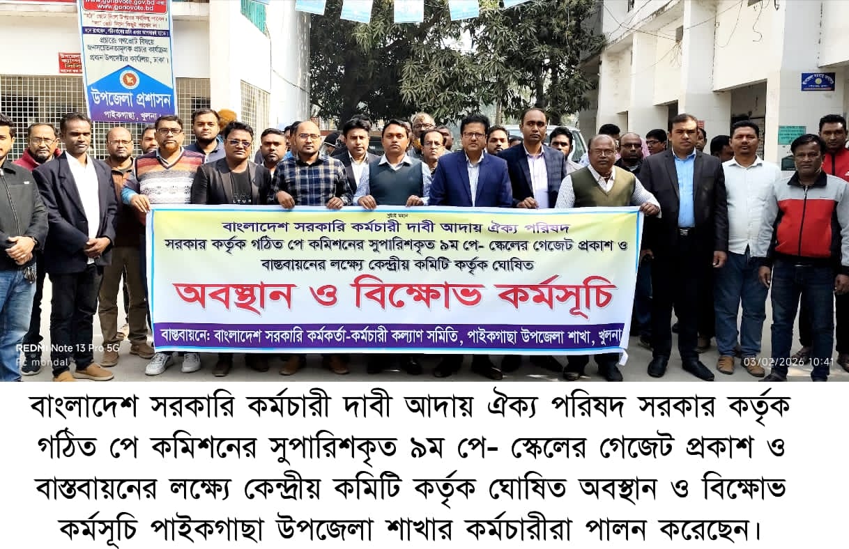 নবম পে-স্কেলের গেজেট জারির দাবিতে পাইকগাছায় সরকারি কর্মকর্তাদের অবস্থান ও বিক্ষোভ কর্মসূচি পালিত