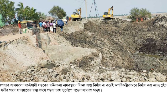 পাইকগাছা (খুলনা) প্রতিনিধি: পাইকগাছায় স্লুইচ গেট নির্মাণ কাজের খাঁদে যাতায়াতের রাস্তা ধ্বসে পড়ায় বন্ধ হয়ে গেছে যোগাযোগ ব্যবস্থা। উপজেলার আলমতলা গড়ইখালী সড়কের বাইনতলা বাজার সংলগ্ন এলাকায় বিকল্প রাস্তা তৈরী না