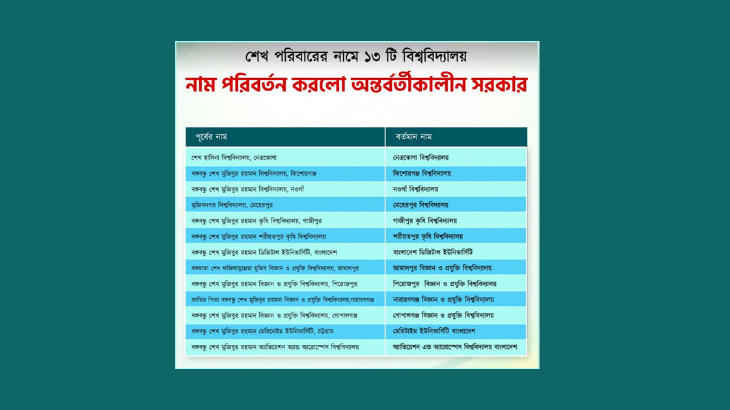 শেখ পরিবারের নামে থাকা ১৩ বিশ্ববিদ্যালয়ের নাম পরিবর্তন