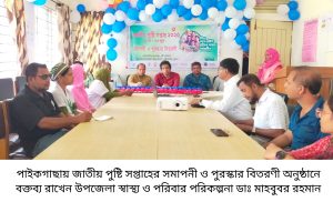 পাইকগাছা ( খুলনা) প্রতিনিধি: খুলনার পাইকগাছায় জাতীয় পুষ্টি সপ্তাহের সমাপনী ও পুরস্কার বিতরণী অনুষ্ঠান মঙ্গলবার দুপুরে উপজেলা স্বাস্থ্য কমপ্লেক্স মিলনায়তনে অনুষ্ঠিত হয়। জনস্বাস্থ্য পুষ্টি প্রতিষ্ঠান ও উপজেলা স্বাস্থ্য বিভাগ এ সমাপনী অনুষ্ঠানের আয়োজন করে। উপজেলা স্বাস্থ্য ও পরিবার পরিকল্পনা কর্মকর্তা ডাঃ মোঃ মাহবুবর রহমান এর সভাপতিত্বে অনুষ্ঠানে সপ্তাহ ব্যাপী পুষ্টি সপ্তাহের কার্যক্রম উপস্থাপন করেন মেডিকেল অফিসার ডাঃ শাকিলা আফরোজ।