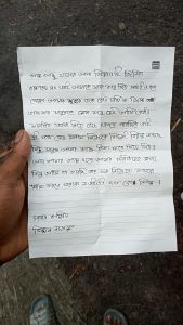 মরদেহের পাশে থেকে উদ্ধার হওয়া চিরকুটে লেখা রয়েছে, আব্বা, আম্মা, হাজেলা আপা, জিয়া ভাই, জিনিয়া তারকরিমসহ সবাই আমাকে মাপ করে দিও, সবাই ভাল থেকো, আমার মৃত্যুর জন্য কেহ দায়ি না। হিংসা অহংকার মানুষকে শেষ করে দেয়। আমি ততটা মানুষিক যন্ত্রণা নিয়ে বেঁচে থাকতে পারছি না, তাই এই পথ বেছে নিলাম। নিজেকে নিজেই বিরক্ত লাগছে, কিছু মানুষ আমার কাছে টাকা পাবে দিয়ে দিও। আর আমার আব্বা হলো পরিবারের রাজা, কিন্তু আমি যা করেছি তার জন্য নিজেকে কখনো ক্ষমা করতে পারবো না। তাই এই পথ বেছে নিলাম। সবার অপ্রিয় বিশ্বাস নাজমুল।