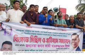 শনিবার বিকেল ৫টায় নব্বইরশী বাসষ্ট্রান্ডে এ প্রতিবাদ সভায় প্রধান অতিথির বক্তৃতায় জেলা বিএনপি নেতা বাগেরহাট-৪, (মোরেলগঞ্জ-শরণখোলা) আসনে দলীয় মনোনয়ন প্রত্যাশী কাজী খায়রুজ্জামান শিপন বলেছেন, স্বাধীনতা বিরোধী রাজাকার ও স্বৈরাচার মিলে ষড়যন্ত্র করে নৈরাজ্য সৃষ্টি করে নির্বাচন বন্ধ করার পায়তারা করছে। যারা কখনও বাংলাদেশের মানচিত্র ও সার্বভৌমত্ত চায়নি সেই জামায়েত ইসলাম নাকি ৭ দফার দাবিতে মুক্তিযোদ্ধাদের সংস্কার করবে। এটি দেশের মানুষ মেনে নিবেন না। তারেক জিয়াকে নিয়ে এই ধরনের কটুক্তি করলে আর ছাড় দেওয়া হবে না। দলীয় নেতাকর্মীরা তা কঠোরভাবে প্রতিহত করবে।