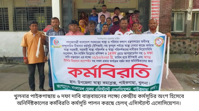 পাইকগাছা (খুলনা) প্রতিনিধি; বাংলাদেশ হেলথ এসিস্ট্যান্ট এসোসিয়েশন এর কেন্দ্রীয় কর্মসূচির অংশ হিসেবে পাইকগাছায় অনির্দিষ্টকালের কর্মবিরতি পালন করছে এসোসিয়েশন এর আওতাধীন কর্মচারীরা। ১ অক্টোবর থেকে কর্মবিরতি শুরু হয়। সরকারি ছুটি শেষে ৪ অক্টোবর শনিবার ও অব্যাহত রয়েছে অনির্দিষ্টকালের কর্মবিরতি কর্মসূচি। স্বাস্থ্য অধিদপ্তর কর্তৃক প্রস্তাবিত মাঠ পর্যায়ে কর্মরত স্বাস্থ্য সহকারীদের নিয়োগ বিধি সংশোধন পূর্বক স্নাতক / সমমান সংযুক্ত করে ১৪ তম গ্রেড প্রদান ও ইন সার্ভিস ডিপ্লোমা প্রশিক্ষণের মাধ্যমে ১১তম গ্রেডে উন্নীতকরণ, টেকনিক্যাল পদমর্যাদা প্রদান, পদোন্নতির ক্ষেত্রে ধারাবাহিক ভাবে পরবর্তী উচ্চতর গ্রেড প্রদান সহ ৬ দফা বাস্তবায়নের দাবিতে ইপিআই এবং টিসিভি টিকাদান ক্যাম্পেইন সহ সকল কার্যক্রম বন্ধ করে এসোসিয়েশন এর পাইকগাছা উপজেলা শাখা এ অনির্দিষ্টকালের এ কর্মবিরতি পালন করছে। কর্মবিরতি পালনের সময় উপস্থিত ছিলেন এসোসিয়েশন এর উপজেলা শাখার সভাপতি সিরাজুল ইসলাম, সহ সভাপতি আবু জাফর, সাধারণ সম্পাদক তুষার সরকার, এম আজিজুর রহমান, মিজানুর রহমান, রীতা সরদার, বেবী সরদার, তরুলতা, কল্পনা বালা, নমিতা গাইন, প্রজিত রায়, সাইফুল ইসলাম, আল আমিন রেজা, রোকেয়া আক্তার, মুসলিমা খাতুন, লাইলী খাতুন ও ঝর্ণা সিকদার সহ সকল স্বাস্থ্য সহকারী।
