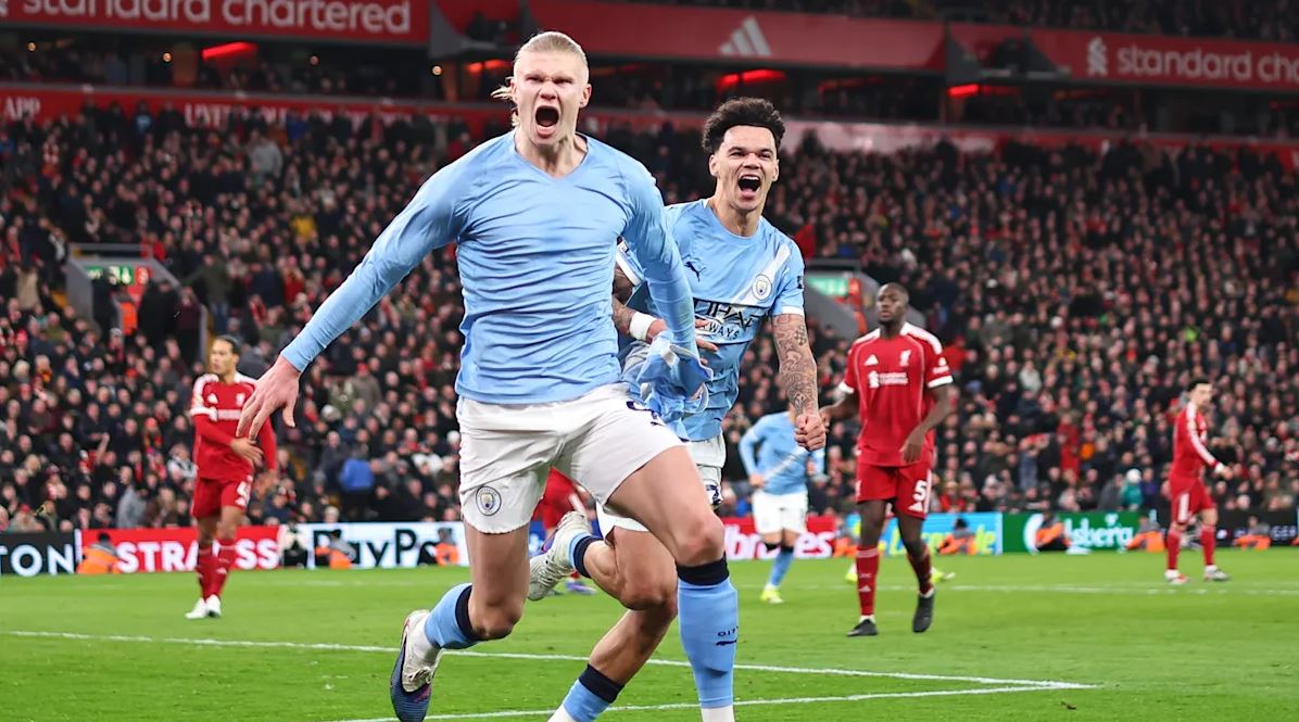 লিভারপুলের মাঠ অ্যানফিল্ডের দীর্ঘদিন ধরে চলা জয়খরা কাটিয়েছে ম্যানচেস্টার সিটি নাটকীয় জয় পেয়েছে ২-১ ব্যবধানে। এই জয়ে ইংলিশ প্রিমিয়ার লিগে শিরোপা জয়ের দৌঁড়ে আর্সেনালের সঙ্গে পয়েন্ট ব্যবধান কমালো সিটি। ২০০৩ সালের পর প্রথম দর্শকপূর্ণ অ্যানফিল্ডে জয়ের দেখা পেল সিটি। গত রোববার অ্যানফিল্ডে সিটি জয় নিয়ে মাঠ ছাড়লেও শেষ মুহূর্তে ছিল জয় নিয়ে শঙ্কা। ম্যাচ শেষ হওয়ার মিনিট ছয়েক আগে বার্নার্দো সিলভার গোল করে ফেরান সমতা। এর আগে, দুর্দান্ত ফ্রি-কিকে ডমিনিক সোবোসলাই দুর্দান্ত এক গোল করে লিড নেয় লিভারপুল। তবে যোগ করা সময়ে আর্লিং হালান্ডের সফল পেনাল্টি কিক সিটিকে পূর্ণ তিন পয়েন্ট এনে দেয়। পেনাল্টিতে পাওয়া গোলের পর আরেকটি গোলের দেখা পায় সিটি। তবে সেটি বাতিল হয়ে যায় ভিএআর যাচাই করার পর। দ্বিতীয় হলুদ কার্ড দেখে মাঠ ছাড়তে হয় সোবোসলাইকে একই ঘটনায়। সিটির কাছে এই পরাজয়ে আগামী মৌসুমে চ্যাম্পিয়ন্স লিগে খেলা আরও কঠিন হয়ে পড়লো বর্তমান চ্যাম্পিয়ন লিভারপুলের। লিগ টেবিলে তারা এখন ষষ্ঠ স্থানে, শীর্ষ পাঁচ থেকে ৪ পয়েন্ট পিছিয়ে।